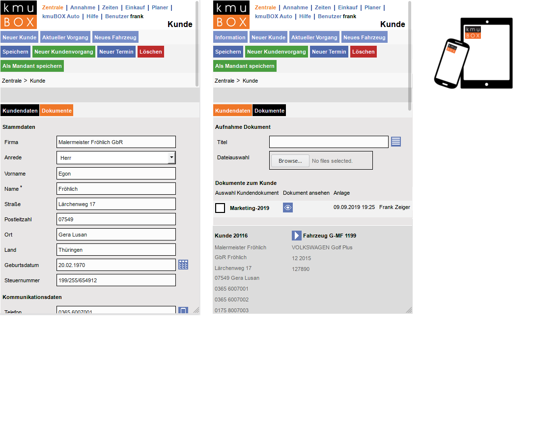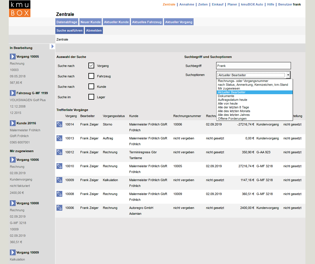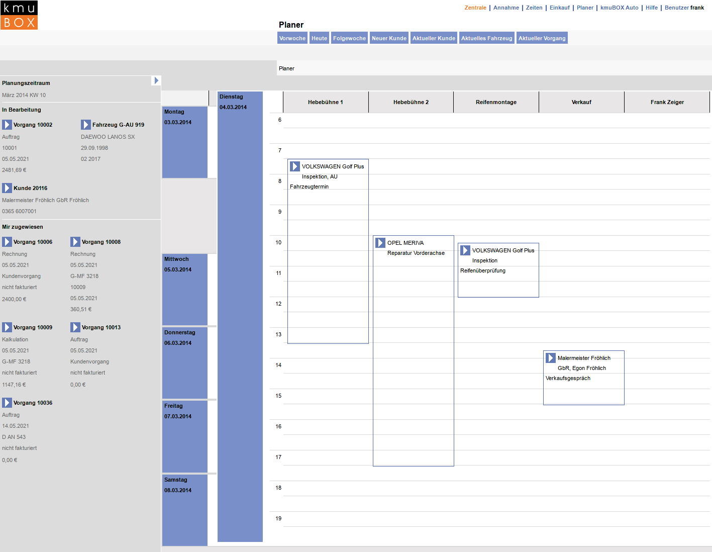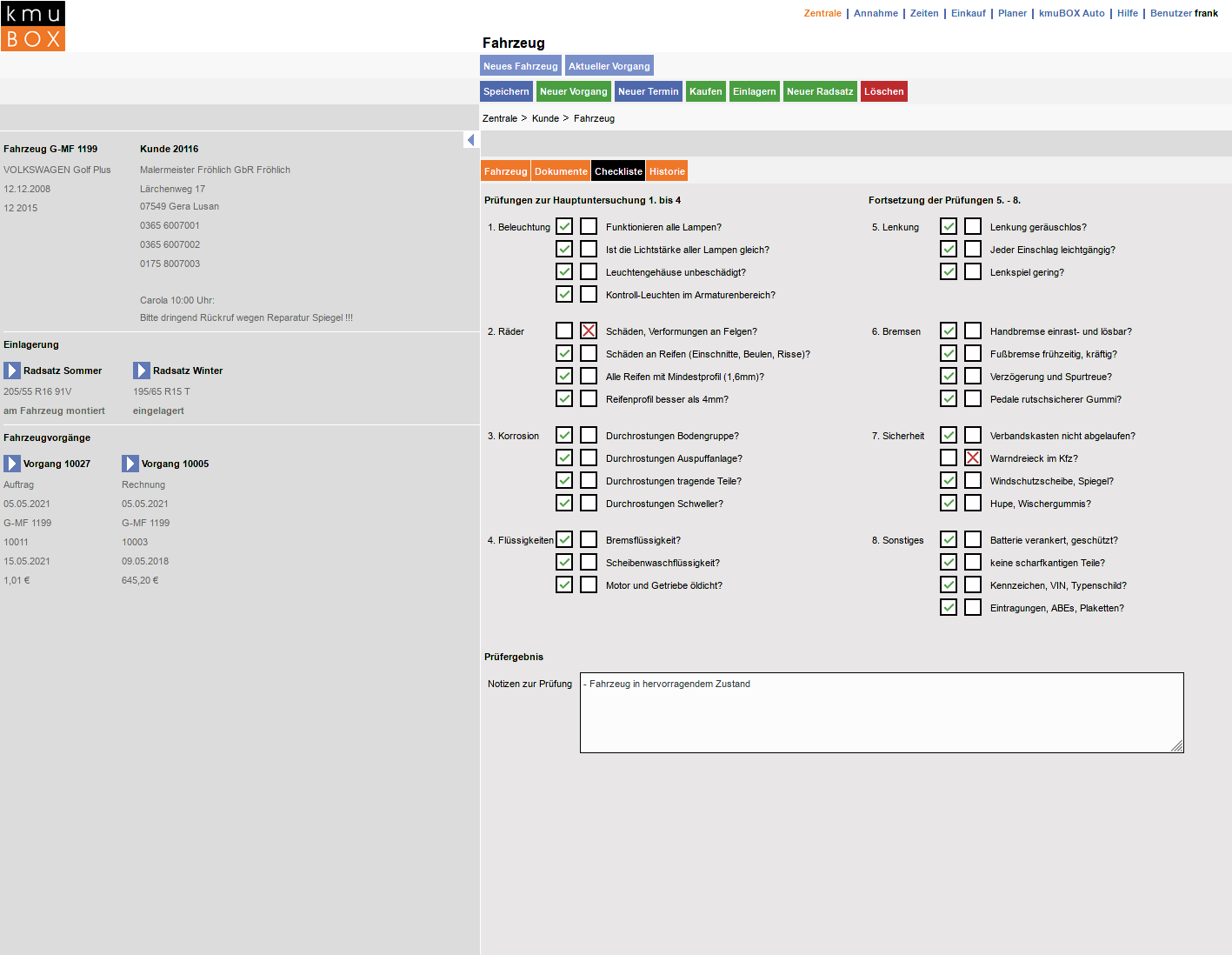 - In kmuBOX® Auto können an Kunde oder Fahrzeug Notizen wie Kundenwünsche oder Anfragen erfasst werden. Im Planer können Termine gespeichert werden. Aufträge und Rechnungen werden in einem Vorgang bearbeitet. Alle Informationen, Daten und Positionen stehen am Vorgang neben Fahrzeug- und Kundendaten zur Verfügung. Der Status zeigt, wo sich der Vorgang im Arbeitsablauf befindet.