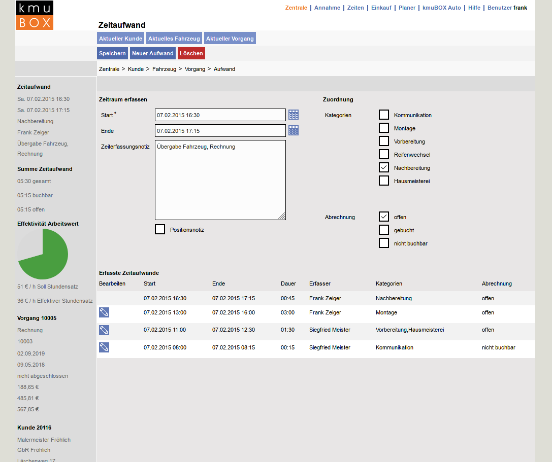 - Zeitaufwände werden am Vorgang durch Ein- und Ausstechen des Mitarbeiters erfasst. Jeder entstandene Gesamtaufwand ist bezogen auf die ausführenden Mitarbeiter dokumentiert.