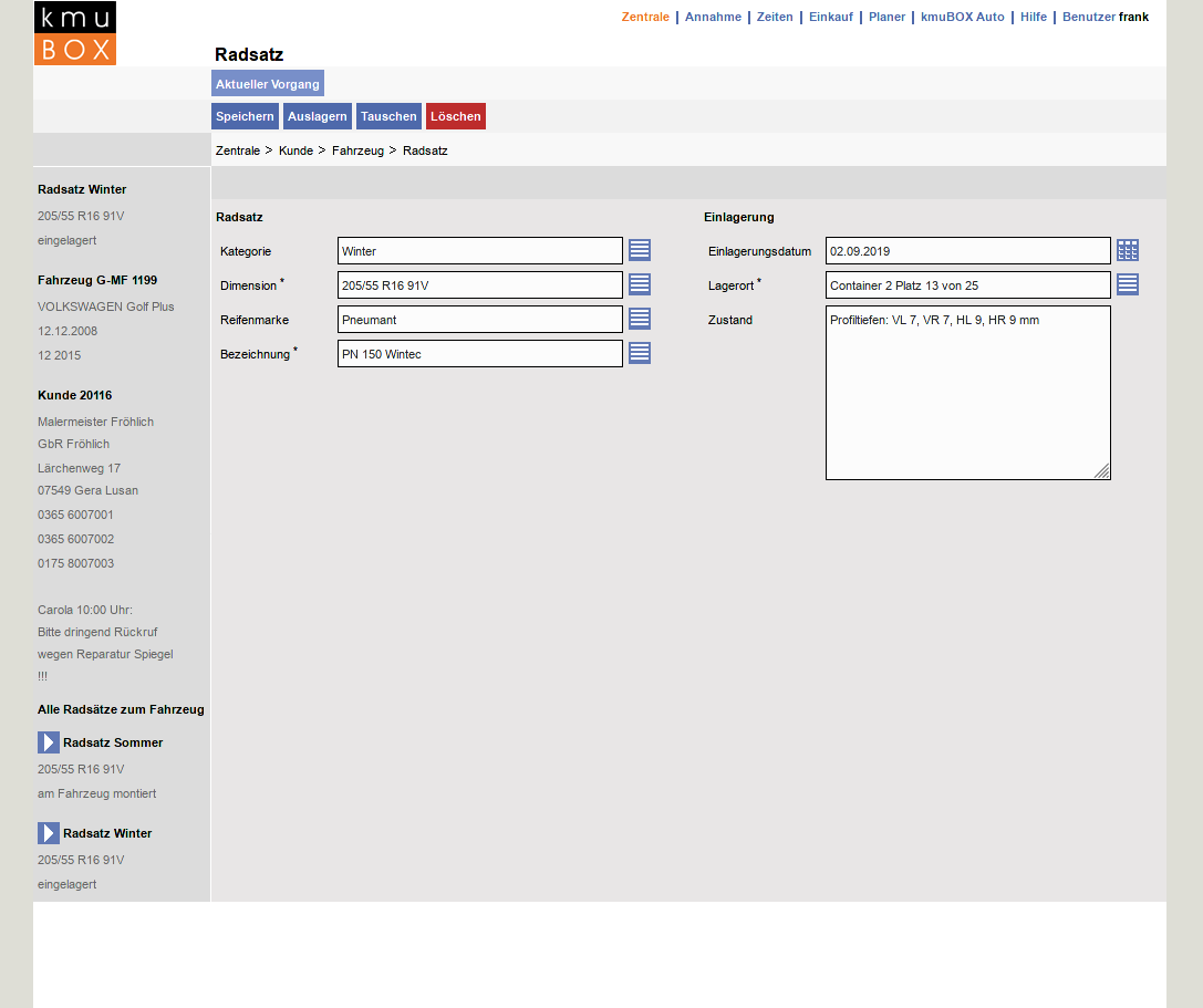 - eingelagerte Radsätze mit Status eingelagert oder montiert werden am Fahrzeug angezeigt