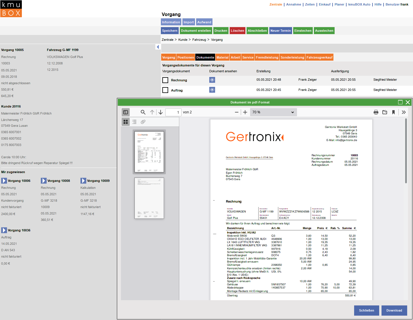 - Neue Vorgänge zu Kunde oder Fahrzeug werden im selbst festgelegten Ablauf abgearbeitet und dem jeweiligen Mitarbeiter zugewiesen. Nach dem Fakturieren ist die laufende Rechnungsnummer unveränderbar vergeben. Der Vorgang kann bis zum Abschließen weiter bearbeitet werden. Nach dem Abschließen ist ein Vorgang beendet und die Vorgangsdaten sind nicht mehr änderbar. Vorgangsdokumente abgeschlossener Vorgänge können nicht gelöscht oder geändert werden und stehen geordnet zum Abruf bereit, was das GoBD konforme Arbeiten erlaubt. Ein abgeschlossener Vorgang kann ggf. storniert werden.