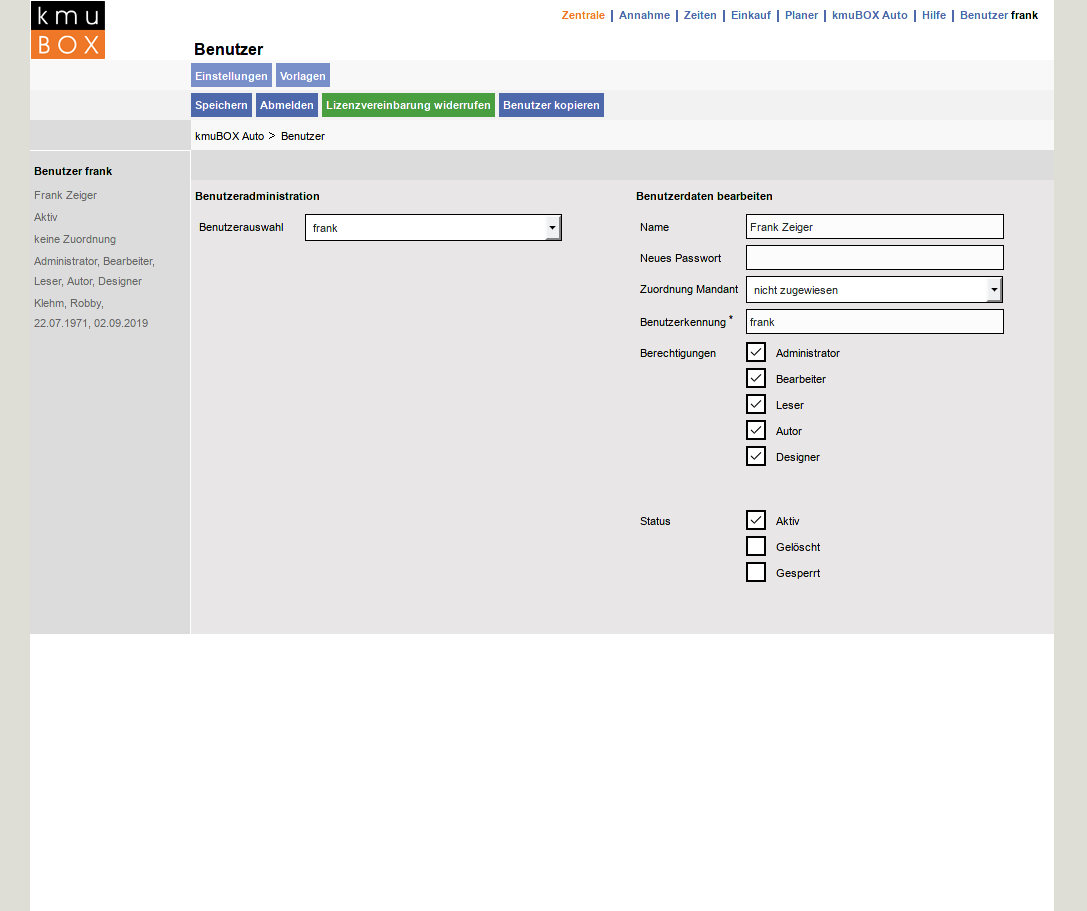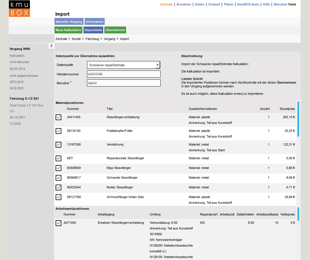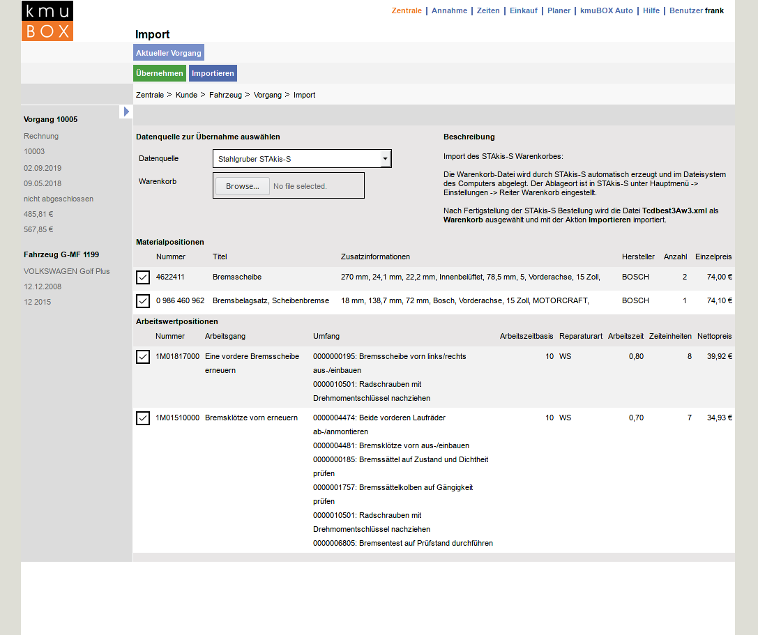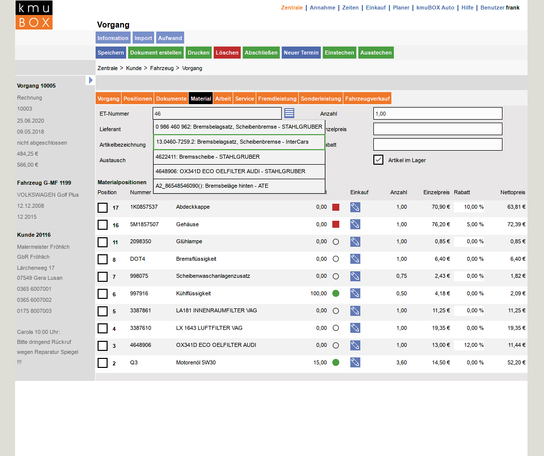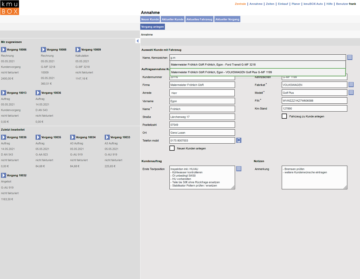 - In kmuBOX® Auto können an Kunde oder Fahrzeug Notizen wie Kundenwünsche oder Anfragen erfasst werden. Im Planer können Termine gespeichert werden. Aufträge und Rechnungen werden in einem Vorgang bearbeitet. Alle Informationen, Daten und Positionen stehen am Vorgang neben Fahrzeug- und Kundendaten zur Verfügung. Der Status zeigt, wo sich der Vorgang im Arbeitsablauf befindet.