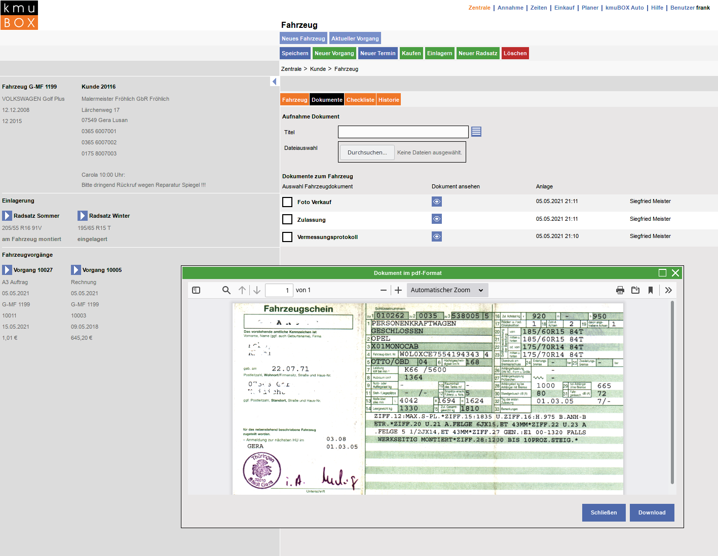 - Zum Fahrzeug gehörende Dokumente wie Zulassung, Schadensgutachten oder Vermessungsprotokolle können nach dem Einscannen am Fahrzeug abgelegt werden.